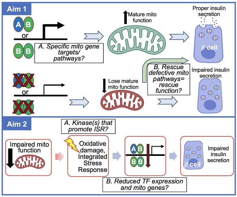 Type 2 diabetes (T2D) can be attributed to loss of β-cell identity or de-differentiation, marked by acquisition of immature cell markers and loss of insulin expression and secretion. While the etiology of β-cell immaturity in T2D is unclear, impairments in nuclear-encoded mitochondrial gene expression and transcription factor (TF) expression occur. Additionally, defects in mitochondrial structure and function leads to impaired glucose- stimulated insulin secretion (GSIS) and have been reported in β-cells of human T2D patients. Interestingly, the transcriptional changes that occur during β-cell immaturity involve loss of the nuclear-encoded mitochondrial gene expression program. My studies will test the hypothesis that β-cell immaturity in T2D is driven by loss of mitochondrial functional gene regulation by the TFs MAF bZIP transcription factor A (MAFA) or B (MAFB). Furthermore, I predict that MAFA/MAFB are themselves targets of mito-nuclear crosstalk through a retrograde signaling cascade induced by defects in mitochondrial function.